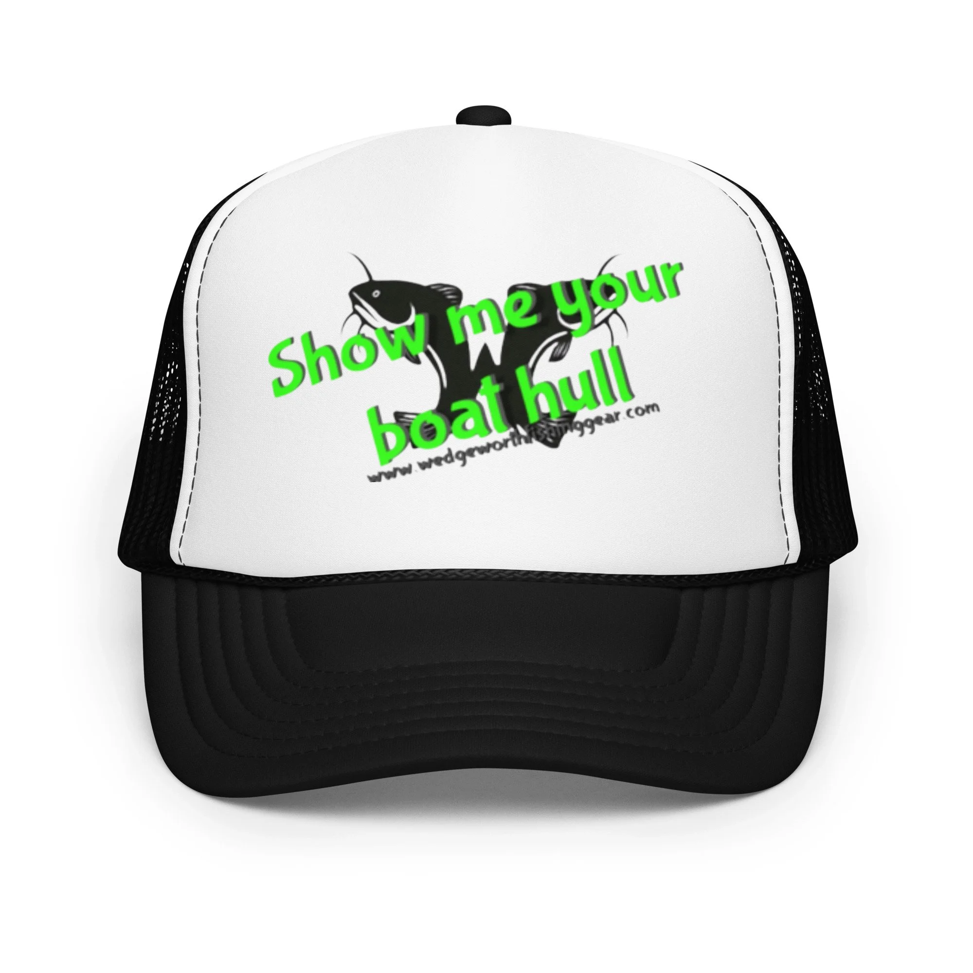 Stand out from the crowd with this trendy Wedgeworth Fishing Gear (Show me your boat hull) foam trucker hat! This hat is made with high-quality polyester and foam that guarantees a premium look and feel. It has an adjustable snap that ensures a comfortable fit, and the mesh back provides great breathability. The matching color braid gives the hat an extra oomph. Wana stand out this is the hat For you this summer.